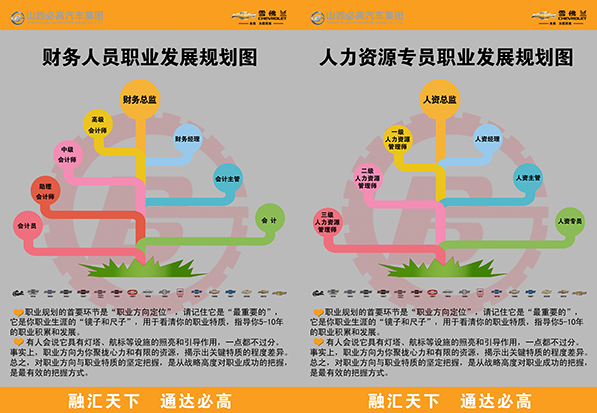 必高融通員工職業發展規劃2014-11-26 11月,必高融通人力資源部針對員工職業發展規劃,策劃員工職業規劃指引圖,目的是圍繞員工職業發展和企業的人力資源需求,通過有效的職業管理,提供有利于員工職業發展的平臺,為員工創造良好的職業發展環境,在員工獲得職業發展的同時,提升公司業績,實現企業目標。員工職業規劃指引圖主要內容包含兩點:1、職業發展樹,清...